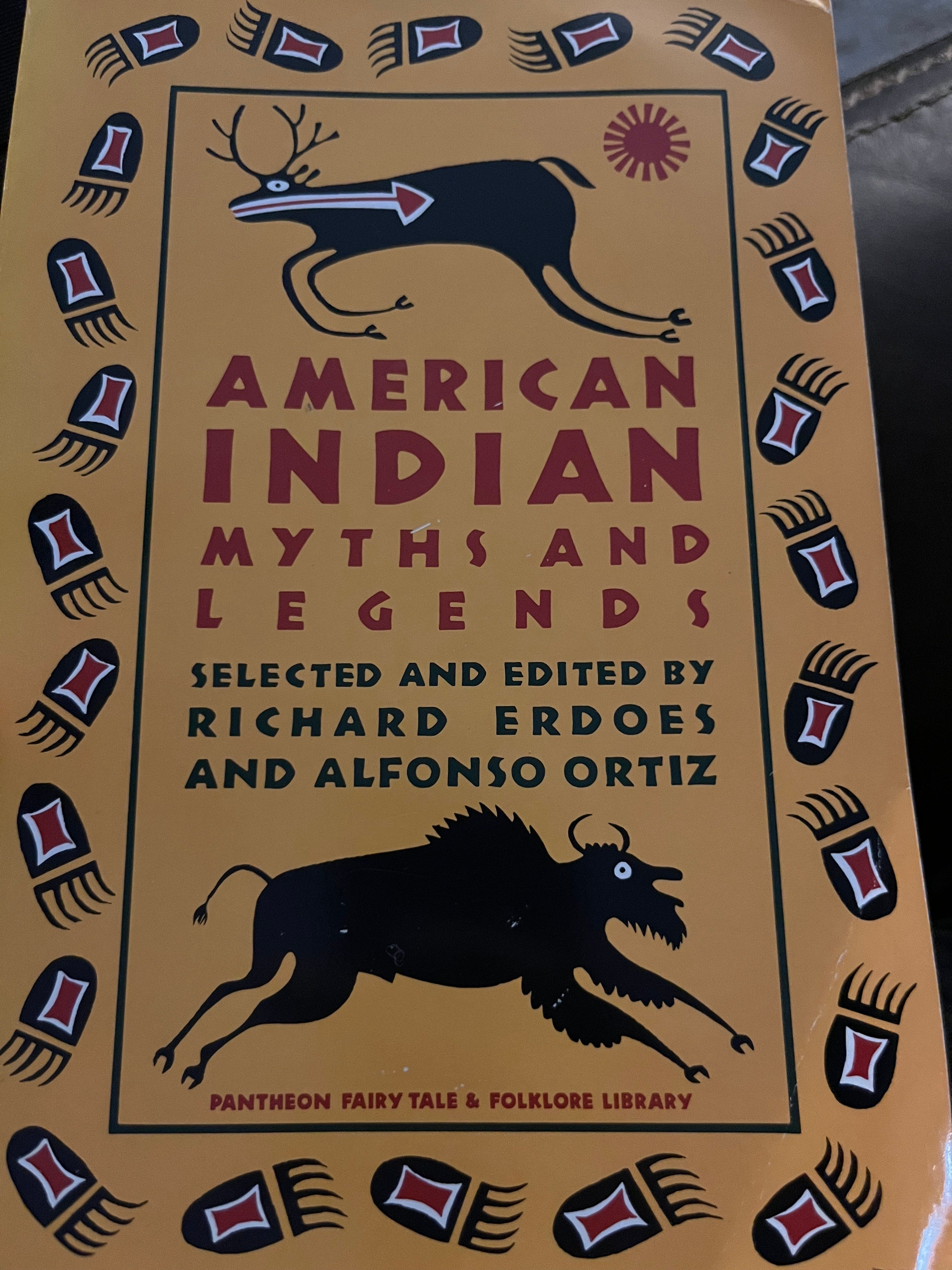 One dark night a young woman alone with her baby was sitting in a longhouse. Everybody had fled and hidden, because someone had seen the great Flying Head darting among the treetops of the forest. The young mother had not run away because, as she said to herself, "Someone must make a stand against this monster. It might as well be me." So she sat by the hearth, building a big fire, heating in the flames a number of
