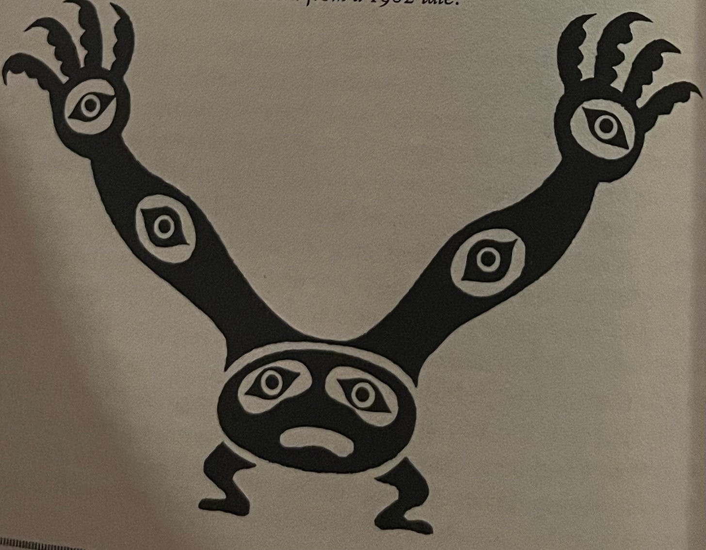 She sat waiting and watching, until suddenly the Flying Head peared in the door. Grinning horribly, it looked into the longhouse, bur she pretended not to see it and acted as if she were cooking a meal. She made believe that she was eating some of the red-hot rocks, picking them up with a forked stick and seeming to put them into her mouth. (In reality she passed them behind her face and dropped them on the ground.) All the while she was smacking her lips, exclaiming: "Ah, how good this is. What wonderful food! Never has anyone feasted on meat
